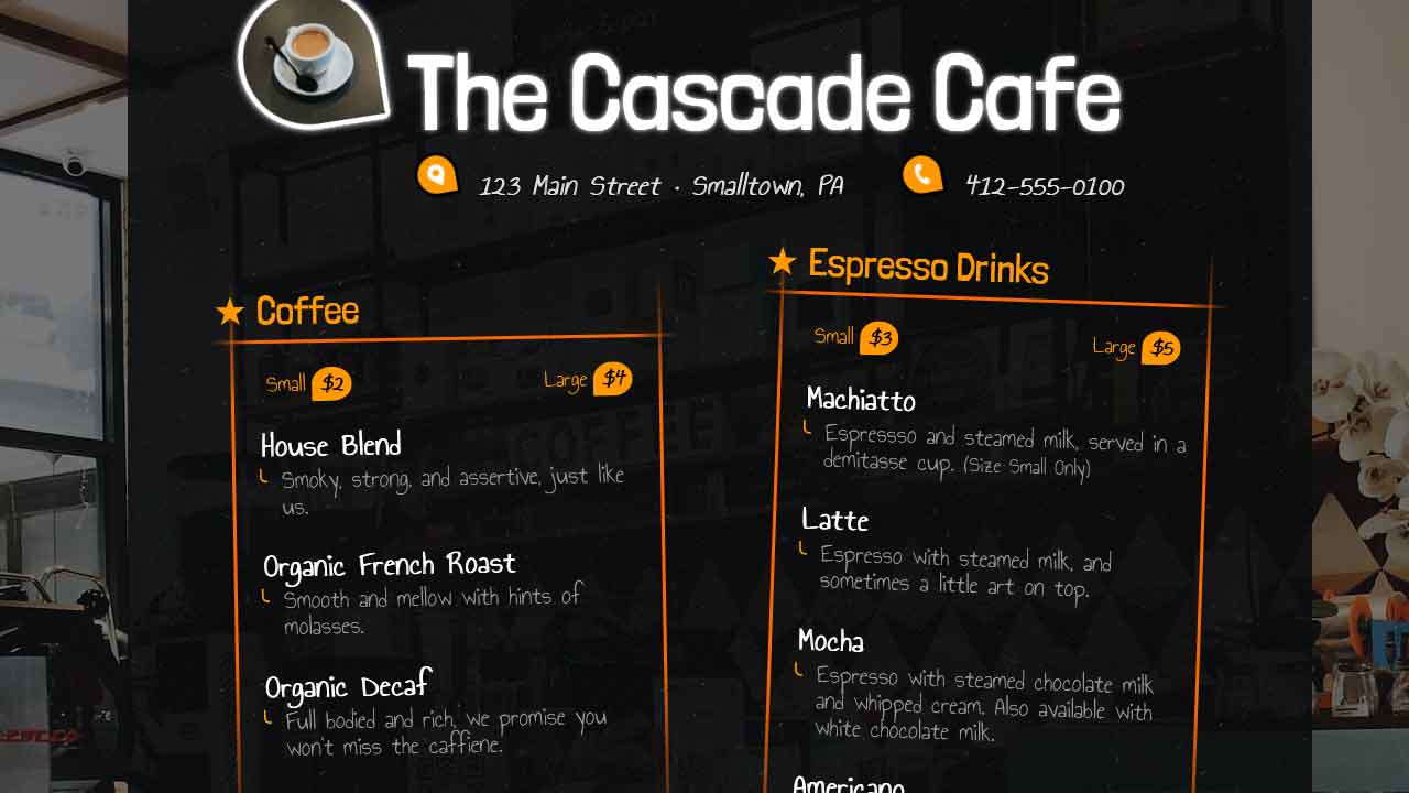 | Cafe Menu | I don't know why I grabbed THIStm menu -I think I was thinking about a VISUAL MENU that can be dynamic. | https://codepen.io/josetxu/pen/oNWgEZV |