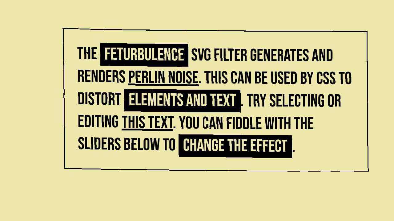 | Turbulence text effect | display via db text description field remove a users edit settings -choose a setting of turbulence. | https://codepen.io/simoncoudeville/pen/zYRygaV |